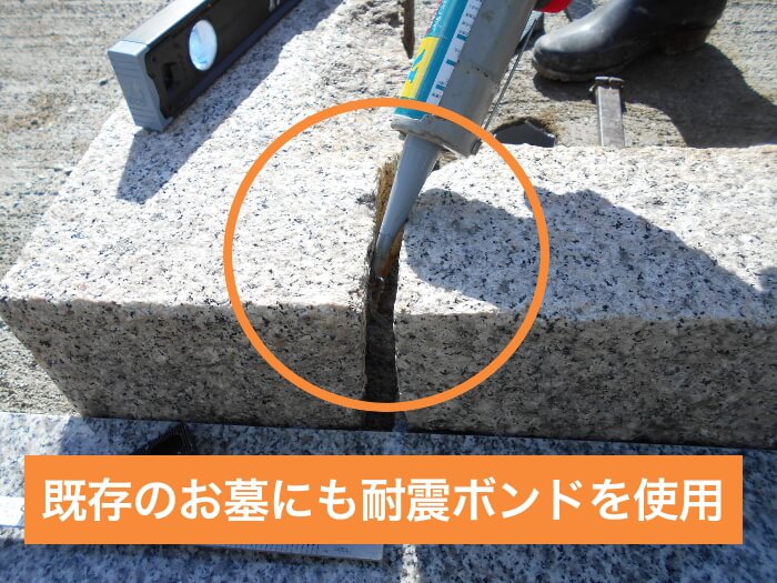 いままであった戦没されたご先祖様のお墓の方も、免震接着剤を使用してしっかりと接着します。