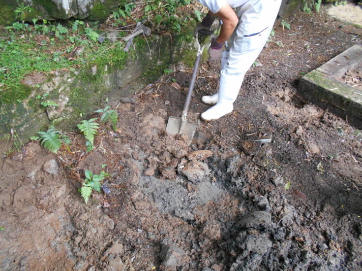 ●舞鶴市寺院墓地での延べ石据え直しと防草、クリーニング工事。ずれて開いていた延べ石を金具と接着剤で固定し据え直し