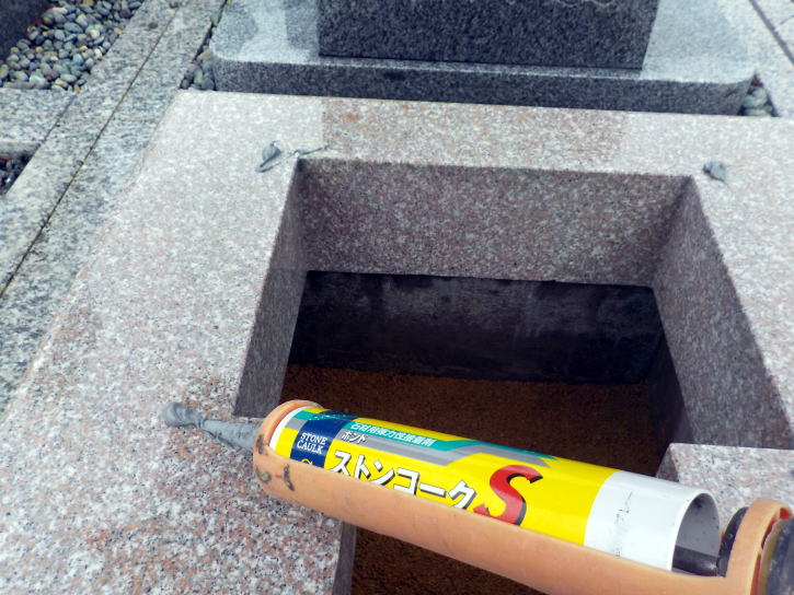 次に竿石を据え付けます。こちらも耐震ボンドで接着施工します。