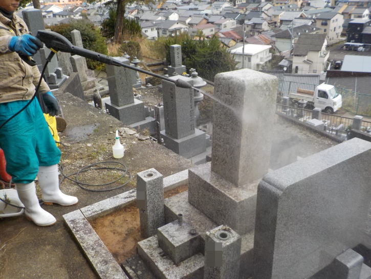 お墓をクリーニングします。まずはクリーニング洗剤を散布します。