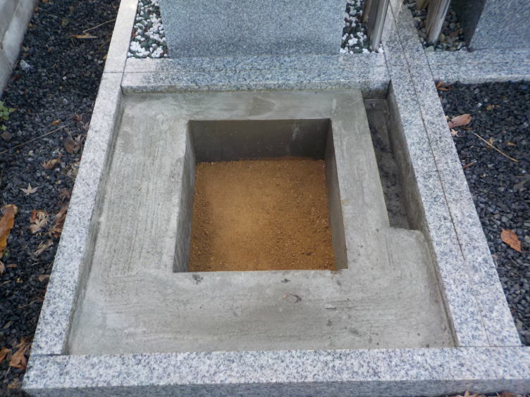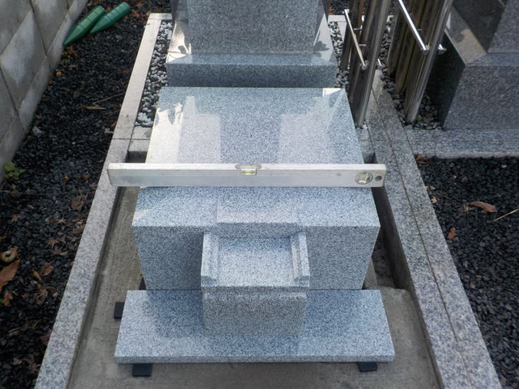 1週間後です。工事後、暖かい日が続きましたので、コンクリートがよく乾いています。キレイな土を敷いてお墓を据え付けます。