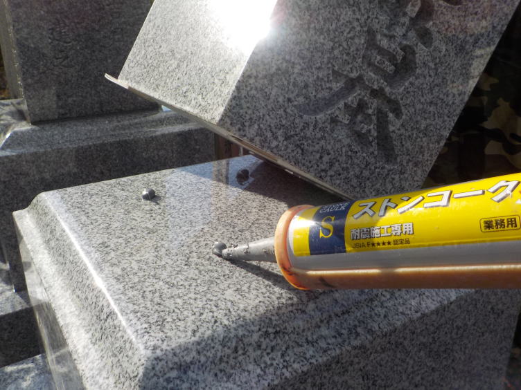 上台の次は竿石の据え付けです。こちらも耐震ボンドを使用して据え付けます。