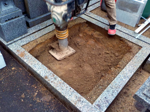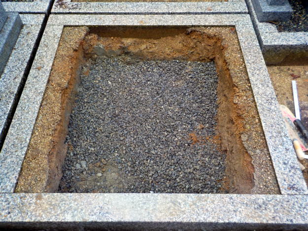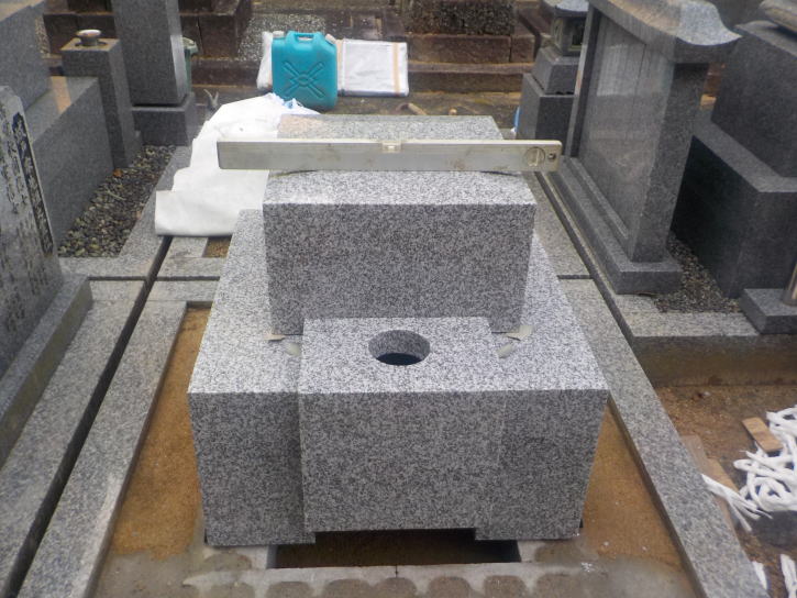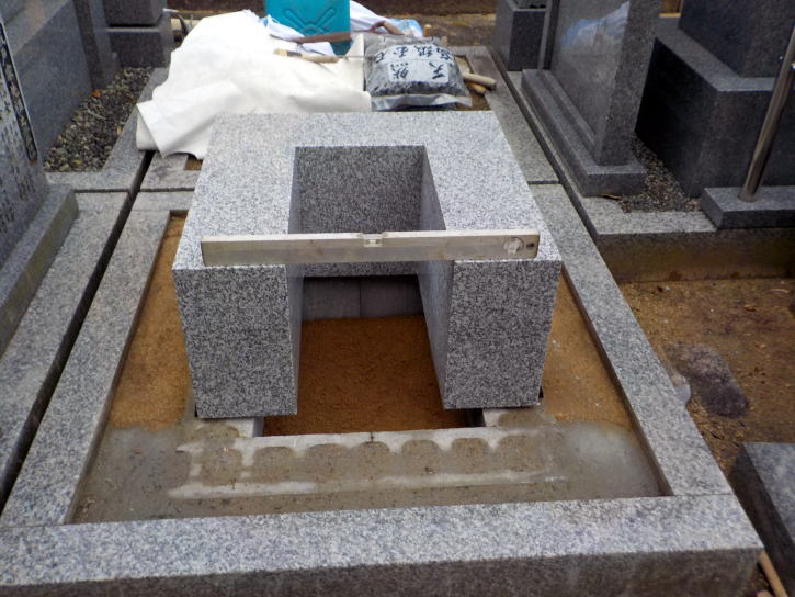 10日程養生して納骨室のコンクリートもしっかり乾いたので、お墓を建てます。まずは下台の据え付けです。