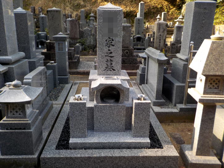 花立を据え付けて、玉石(那智黒)を敷いて工事完成です。お墓の大きさは、宮津型9寸サイズです。