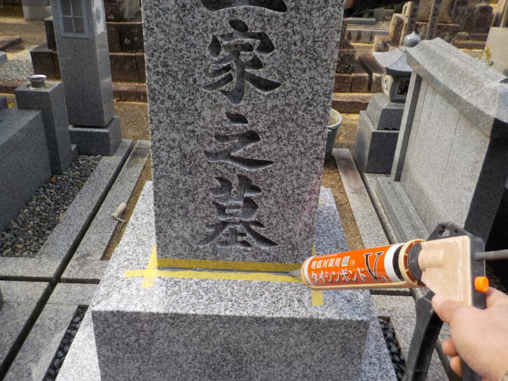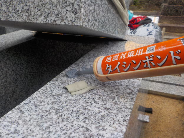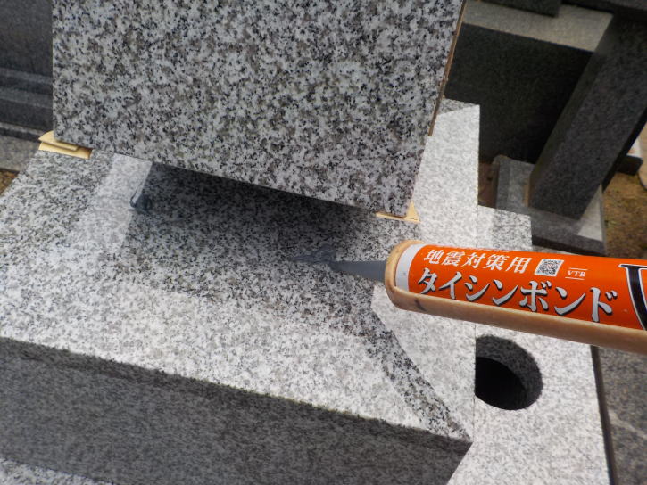 次は竿石の据え付けです。こちらも耐震ボンドを使用し据え付けます。