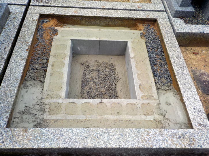次に、ブロックで納骨室を据え付けます。据え付け完了したら1週間程養生してお墓を建てます。