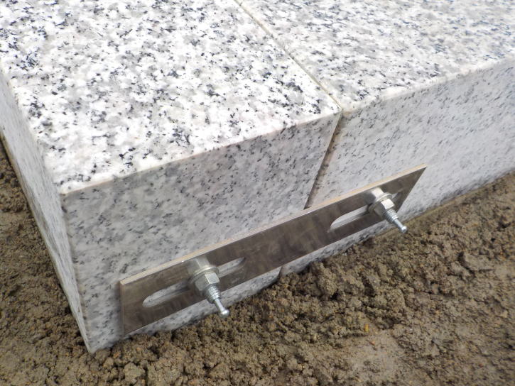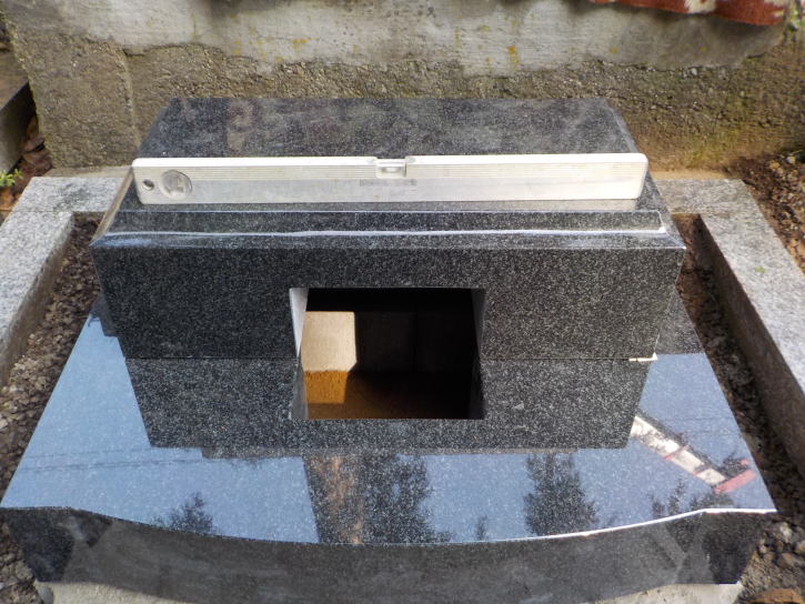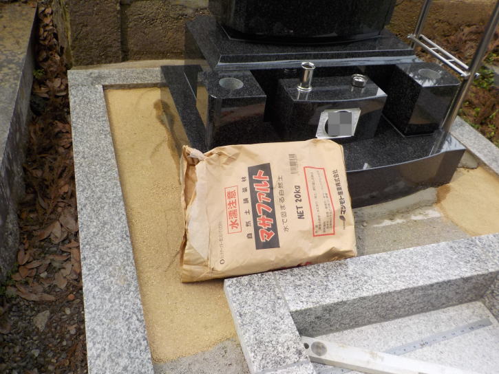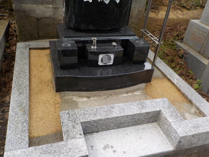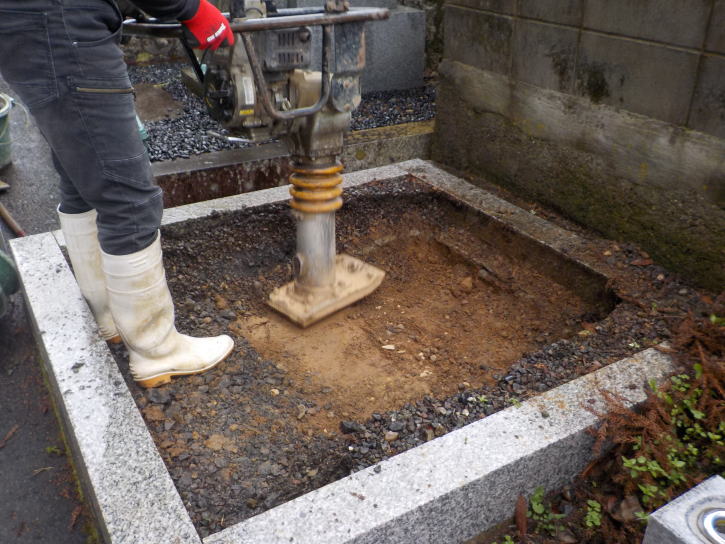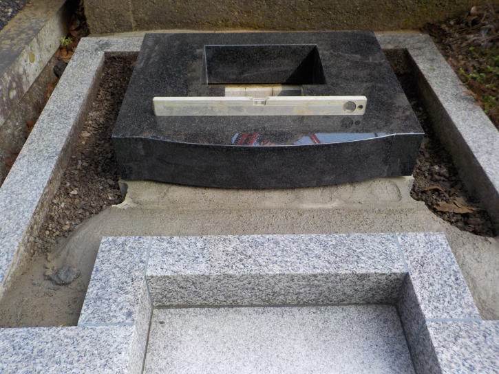 数日間養生した後、お墓を建てます。まずは下台の据え付けです。