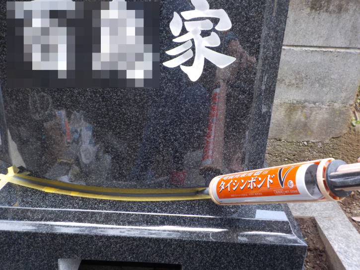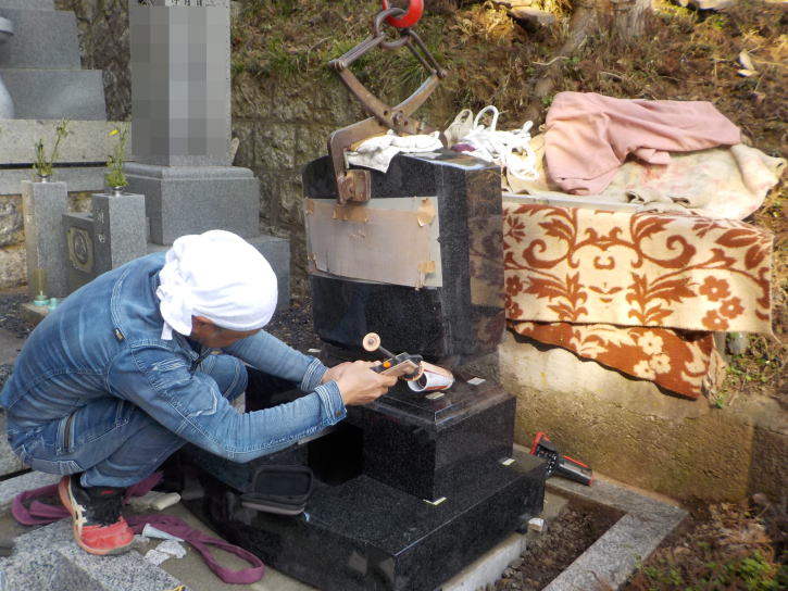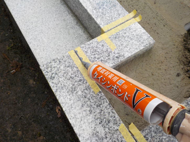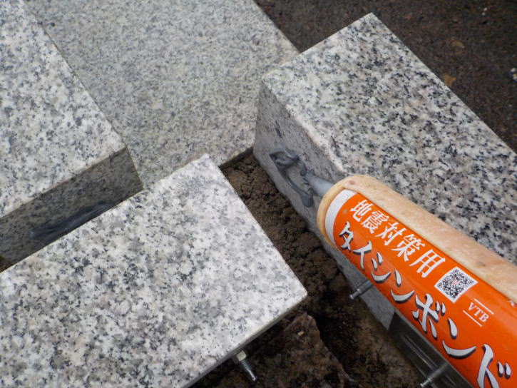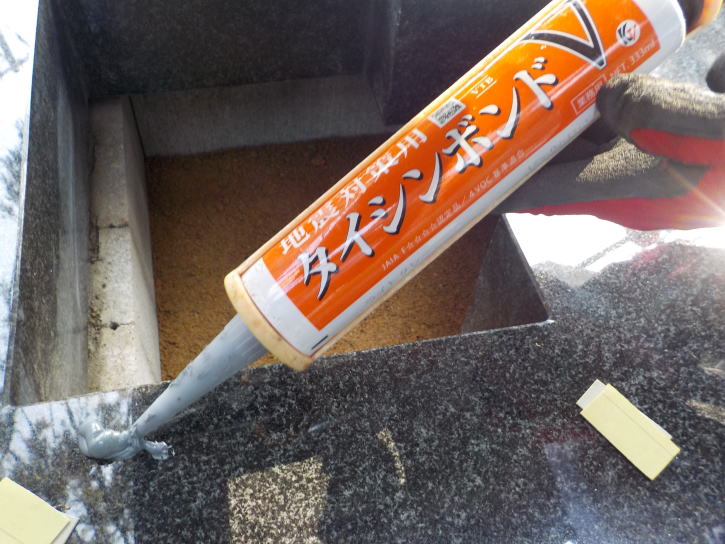 次に竿石据え付けです。こちらも耐震ボンドを使用し据え付けます。
